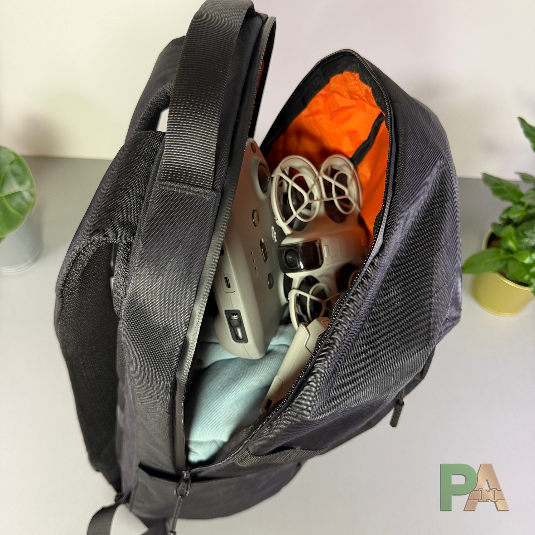 Wariant na miasto: iPad 11" / MacBook Air 13", cienka kurtka przeciwdeszczowa, bluza, dron DJI Neo z kontrolerem oraz akcesoria, duże słuchawki nauszne, z boku butelka 0,7 l. W środku zostaje jeszcze dużo miejsca — zmieści się mała kosmetyczka, bielizna i T-shirt na zmianę.