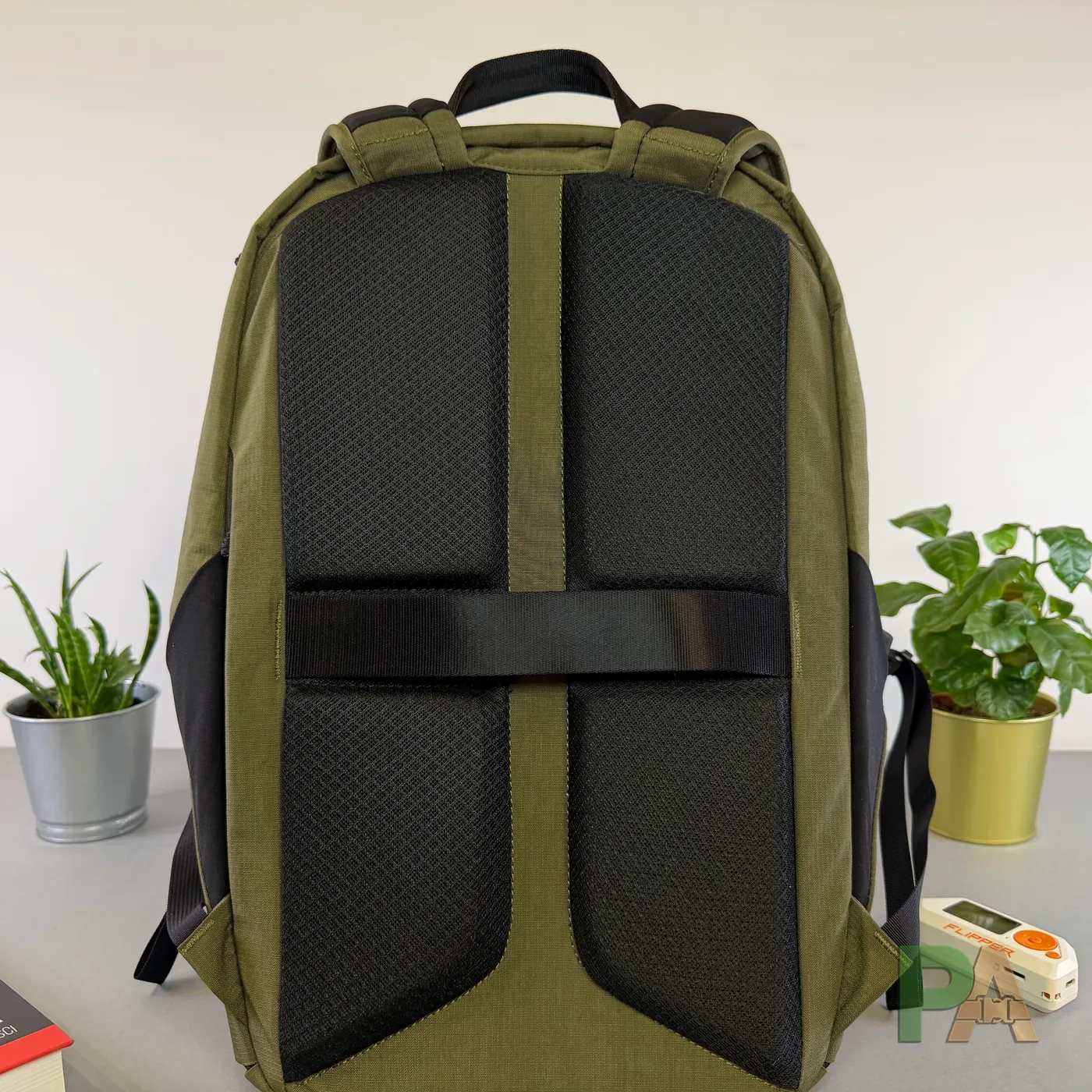 System nośny zaliczył solidny upgrade w stosunku do wcześniejszych plecaków tego producenta. Na plecach znajdziemy grubą piankę air-mesh z kanałem powietrznym po środku. Widać tutaj podobieństwo do AER, ale w tym najlepszym wydaniu. Plecak ma dość sztywne plecy, podobnie jak Elements Backpack Pro - to był jego główny mankament, tutaj jest podobnie. Evergoods pozwala wyjąć usztywnienie, w plecakach AER plecy są na tyle elastyczne, że zginają się bez problemu. Taka konstrukcja może być problematyczna w tanich liniach lotniczych.