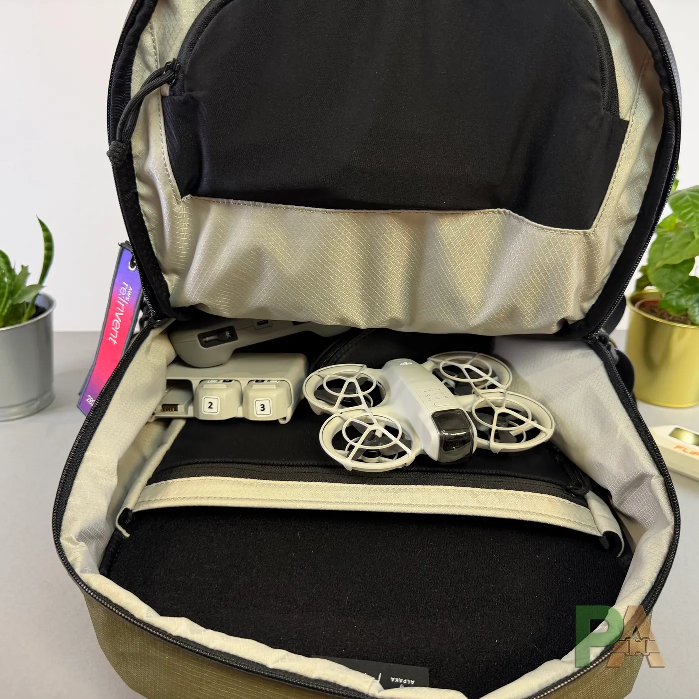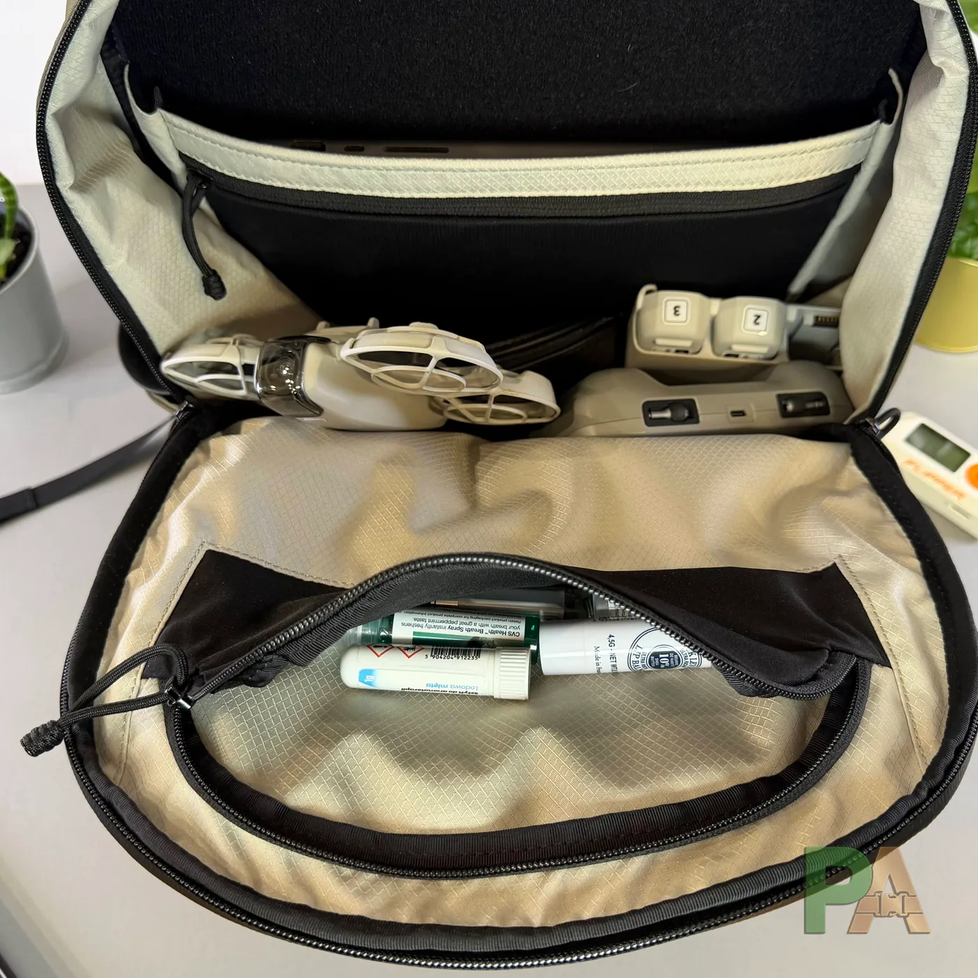 - Konfiguracja 2 – na miasto: MacBook Air 13", ładowarka, cienka kurtka przeciwdeszczowa, dron DJI Neo z kontrolerem oraz akcesoria, butelka termiczna 0,6 l. Do środka jeszcze coś wejdzie, np. t-shirt lub szalik i czapka, ale nic dużego.