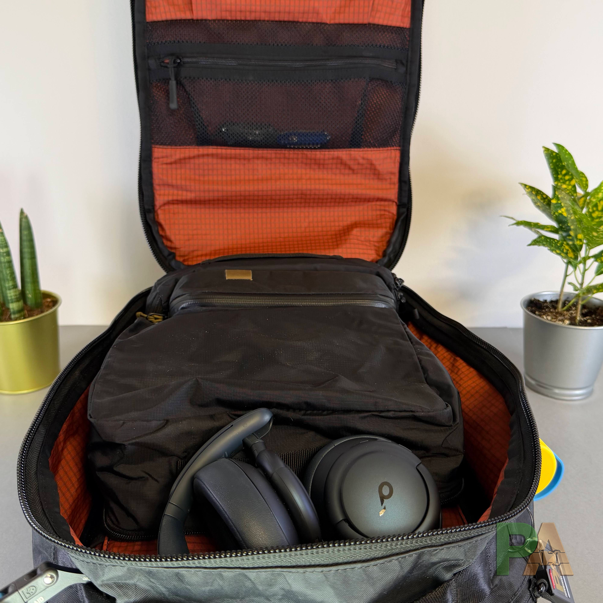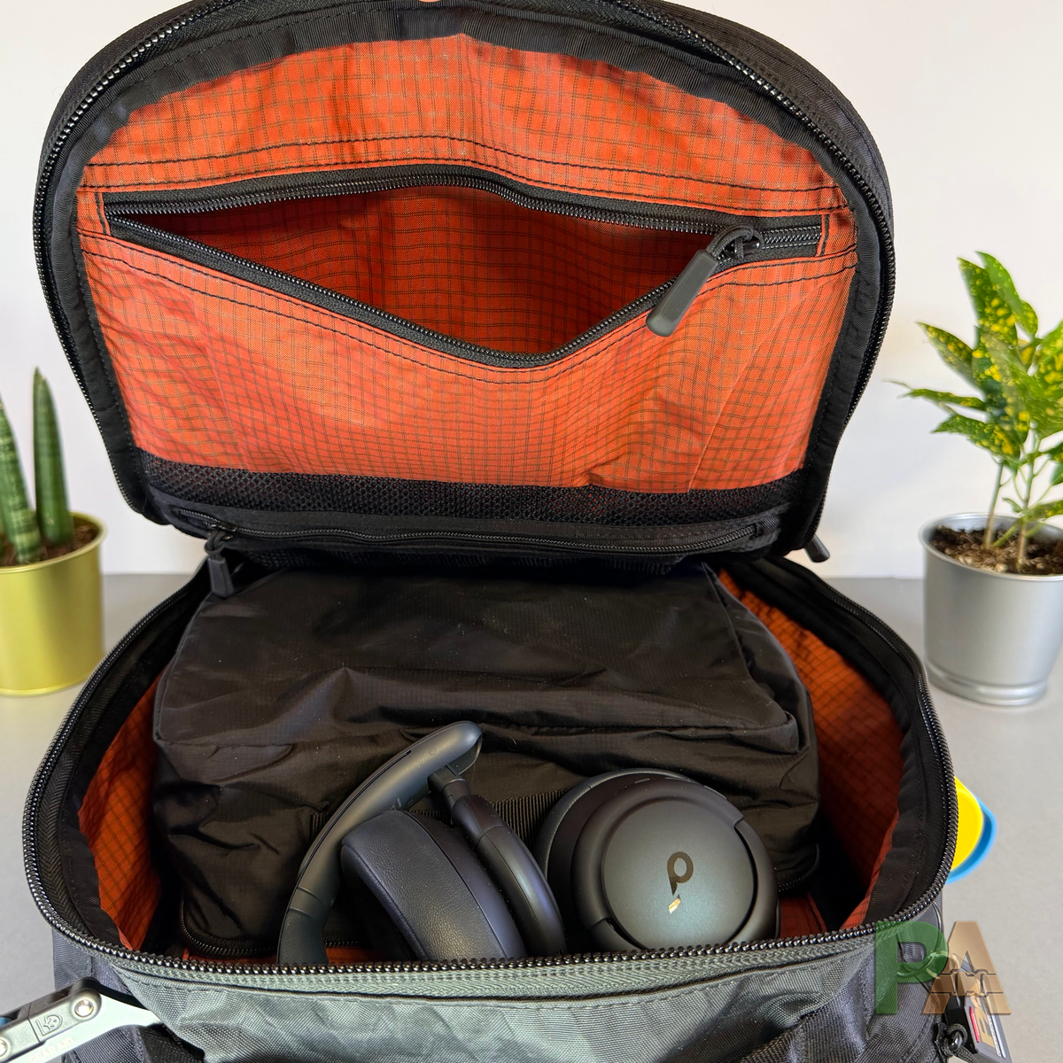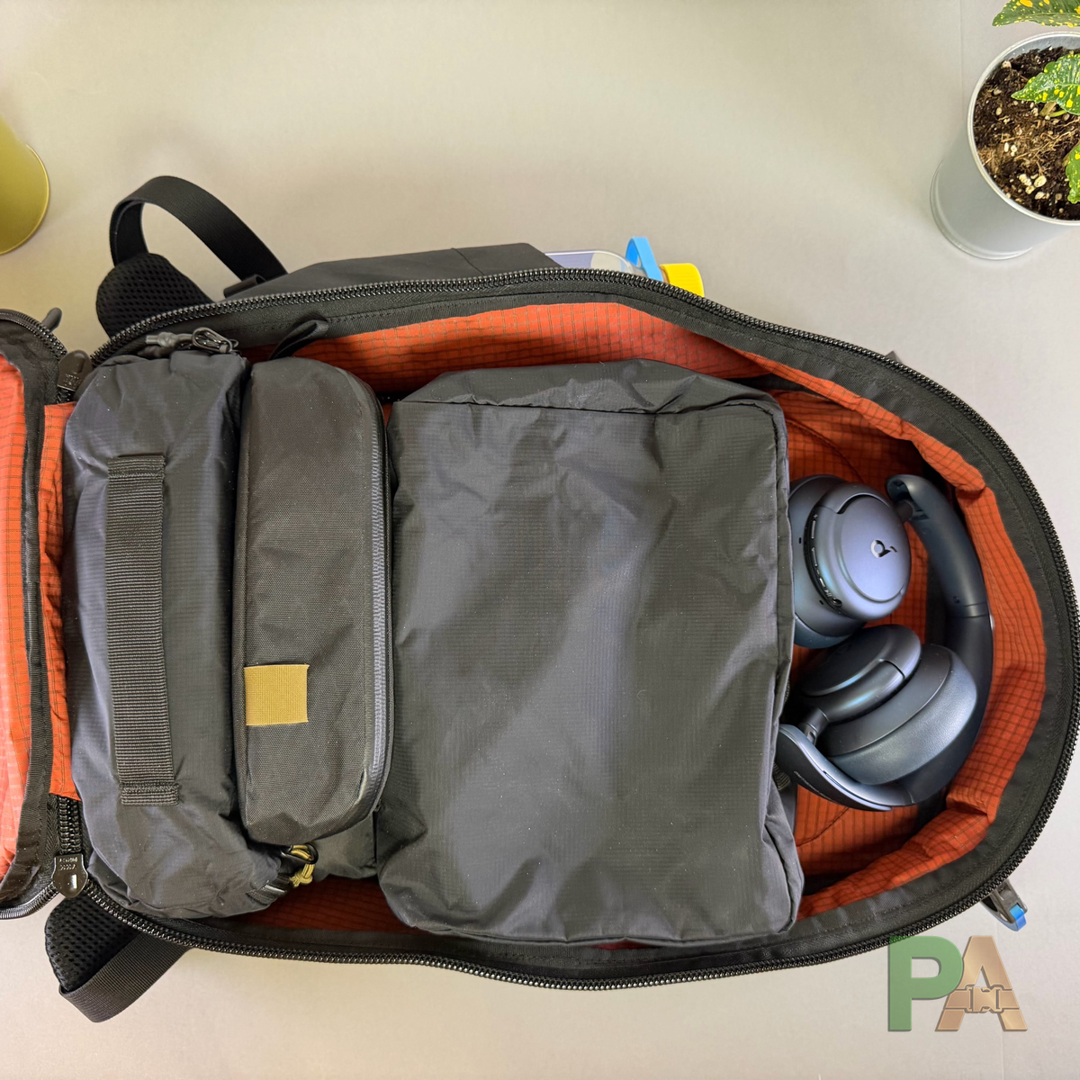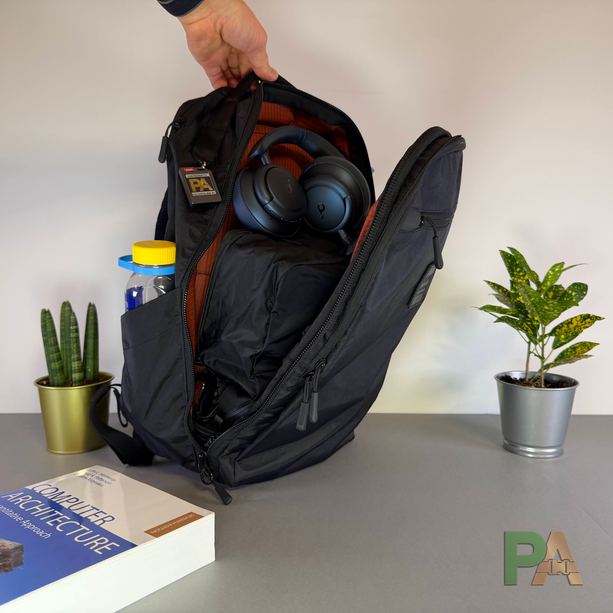 - Wariant do pracy - MacBook Pro 14", mini pouch AER czy Evergoods z akcesoriami, cienka kurtka, bluza (spakowana w organizer Matador), słuchawki nauszne Soundcore, parasol, butelka 0,7 l. Plecak zachował formę, zostało trochę miejsca - można by dołożyć warstwę grubości ok. 3–5 cm. Sprawdził się bardzo dobrze.