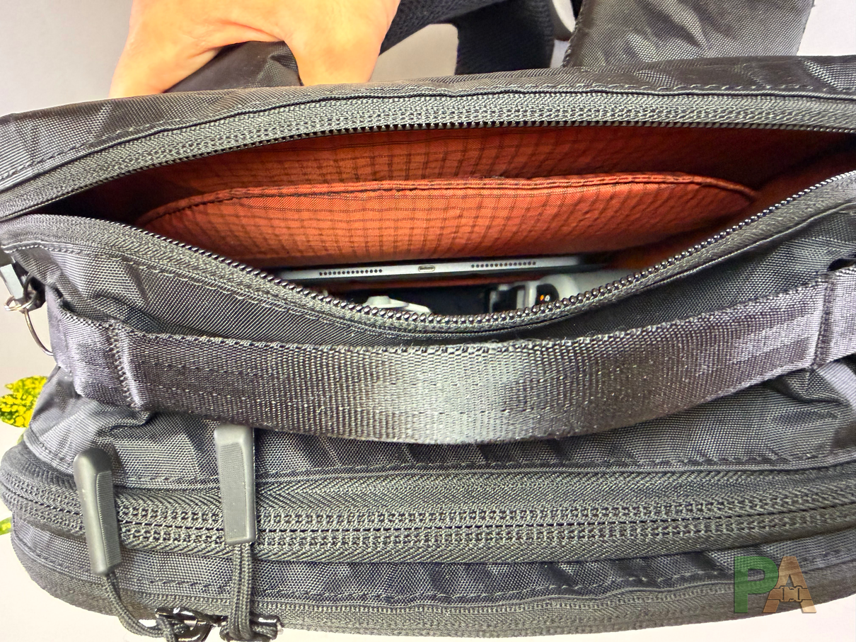 Sama kieszeń jest bardzo dobrze wyściełana i odizolowana od spodu, choć ciasna - MacBook Pro 14" wchodzi bez większego problemu, ale grubszy laptop 15" czy 16" nie wejdzie łatwo (choć producent deklaruje, że MacBook Pro 16” wejdzie). Na froncie kieszeni znajduje się druga, wyściełana przegroda na tablet - równie ciasna.