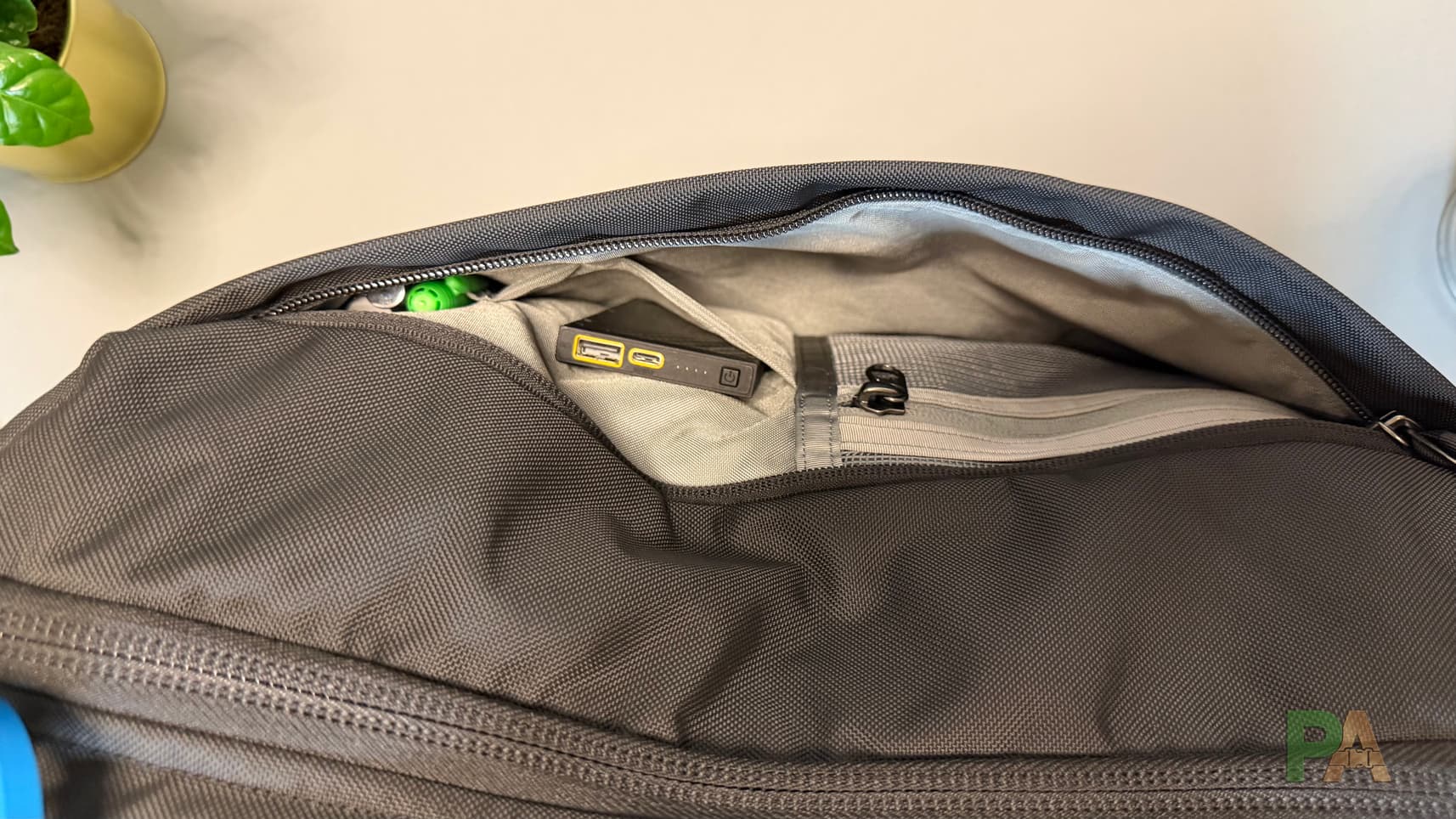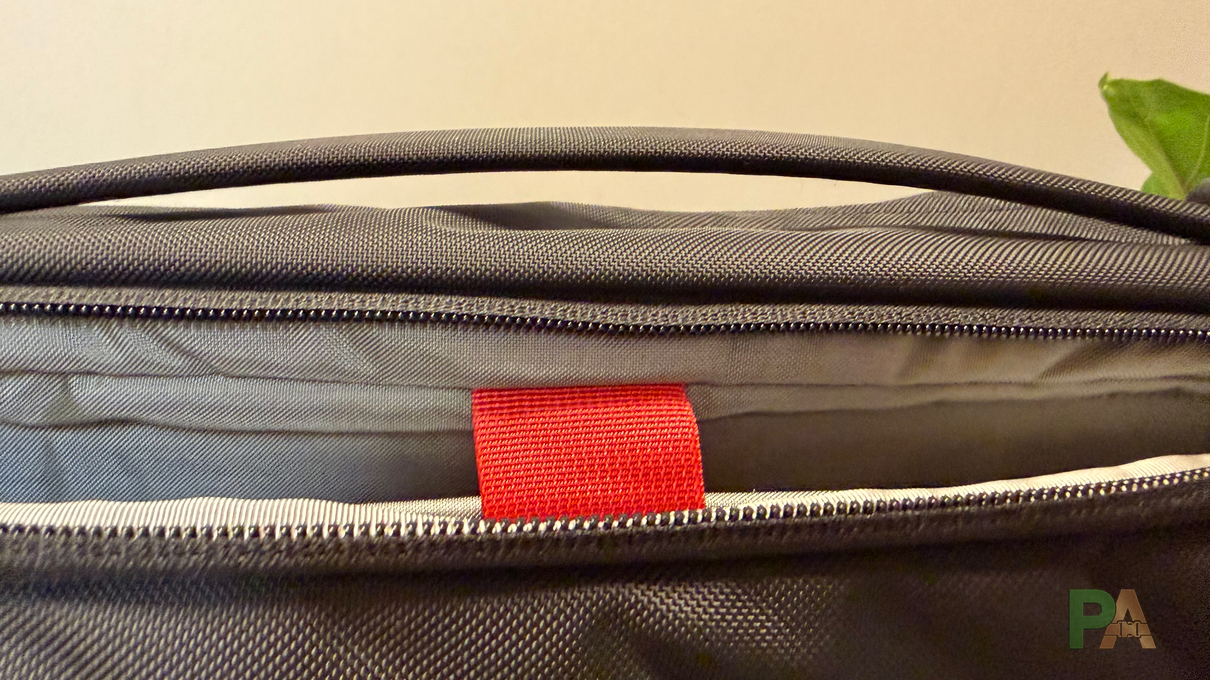 Wewnątrz panelu administracyjnego znajdziemy jedną małą kieszonkę na suwak (zmieszczą się tam kable, ładowarka, może mały stojak do telefonu), powyżej kieszeń idealną na powerbank, a nad nią kieszeń na długopisy — nie za wiele, ale da się tam zmieścić podstawy. Do tego mamy jedną kieszeń szybkiego dostępu umieszczoną bezpośrednio przy szelkach — jest bardzo pojemna; znajduje się w niej pasek do przypięcia kluczy.