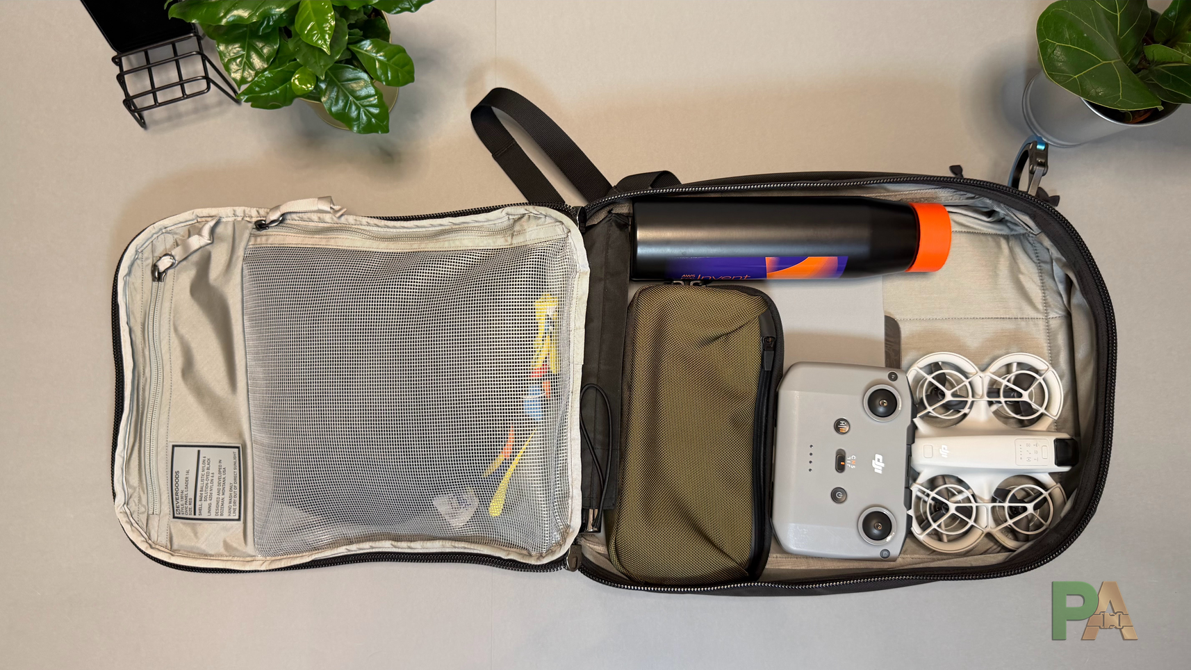 - Konfiguracja 2 – poza pracą: iPad 11″ / MacBook Air 13″, tech-pouch z ładowarkami i myszką, cienka kurtka przeciwdeszczowa, dron DJI Neo z kontrolerem oraz akcesoria, butelka 0,7 l; z większą butelką nie ma już za wiele miejsca.