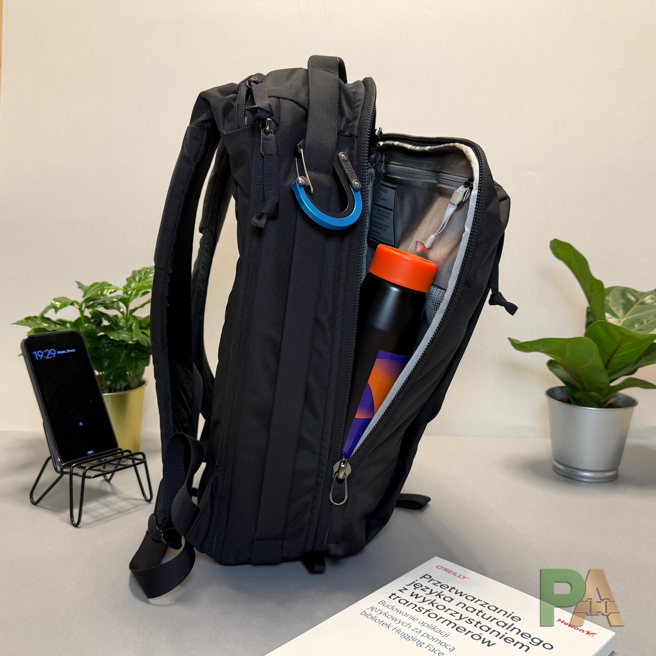 Komentarz: zestaw mieści się podobnie jak w plecakach konkurencji, tylko jest trochę chaos w środku. Zostaje miejsce na małą butelkę, ale brak zewnętrznej kieszeni sprawia, że wożenie jej w środku potrafi zwiększać bałagan — to dla mnie największa wada w codziennym EDC.