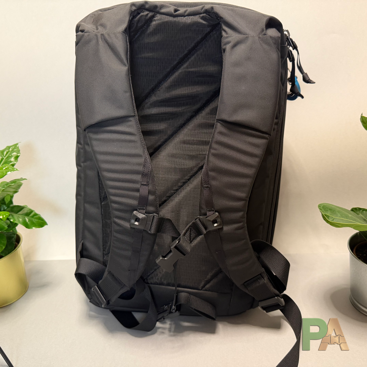 Szelki są miękkie i wygodne, plecy mają warstwę amortyzacji, ale nie jest to typowy Air Mesh — to autorskie rozwiązanie Evergoods składające się z oddychającej warstwy pokrytej oddychającym nylonem. Brakuje kanału wentylacyjnego, nie ma też paska do zaczepienia na walizce. Materiał jest dosyć śliski, przez co plecak trochę się przesuwa, ale zapięcie paska piersiowego załatwia sprawę. W praktyce wentylacja jest dobra i nie odbiega od konkurencji — dodałbym jedynie kanał powietrzny.