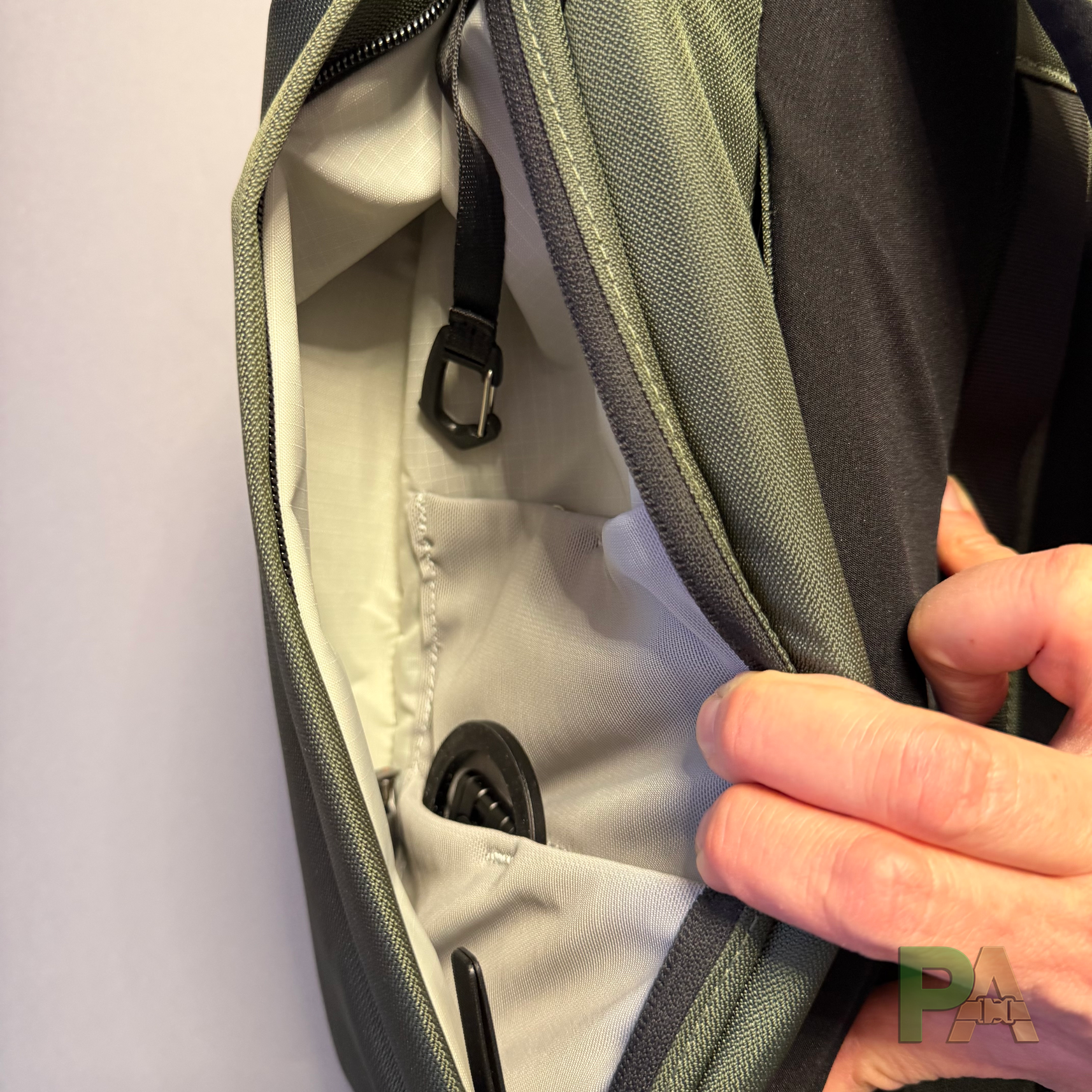Po otwarciu klapy mamy niezbyt duży dostęp do wnętrza, ale po obu stronach panelu przedniego znajdują się suwaki, po ich rozsunięciu zyskujemy wygodny dostęp do całego wnętrza. Przy zamkniętej klapie możemy rozsunąć boczne suwaki, dzięki temu zyskujemy łatwy, szybki dostęp do wnętrza plecaka gdy nosimy go na jednym ramieniu.
