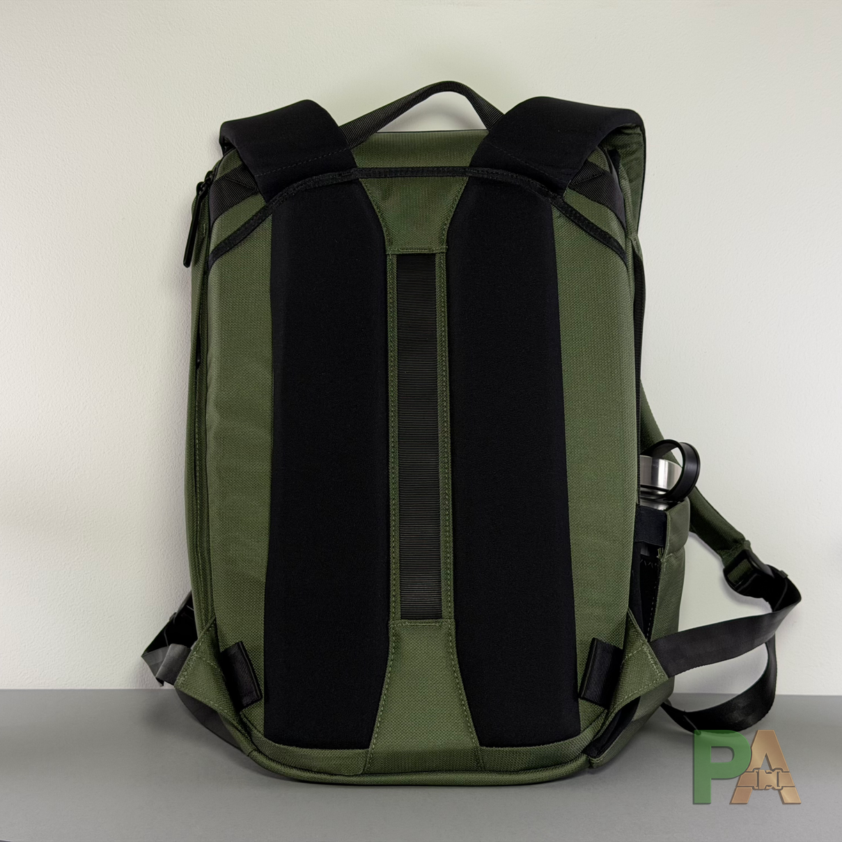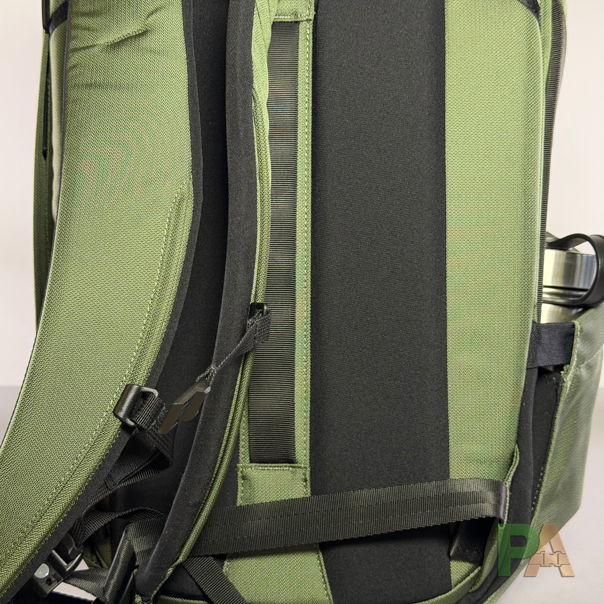 System nośny podobnie jak pozostałe elementy konstrukcyjne jest na najwyższym poziomie i świetnie przemyślany. Na plecach mamy szerokie, mięsiste podparcia z miękkiej pianki pokrytej oddychającym materiałem. Rozdziela je kanał powietrzny na którym znajduje się pasek do uchwytu na walizce. Choć pianka nie jest tak miękka i wygodna jak airmesh, bardzo dobrze dopasowuje się do ciała i w praktyce plecak nosi się bardzo wygodnie.
