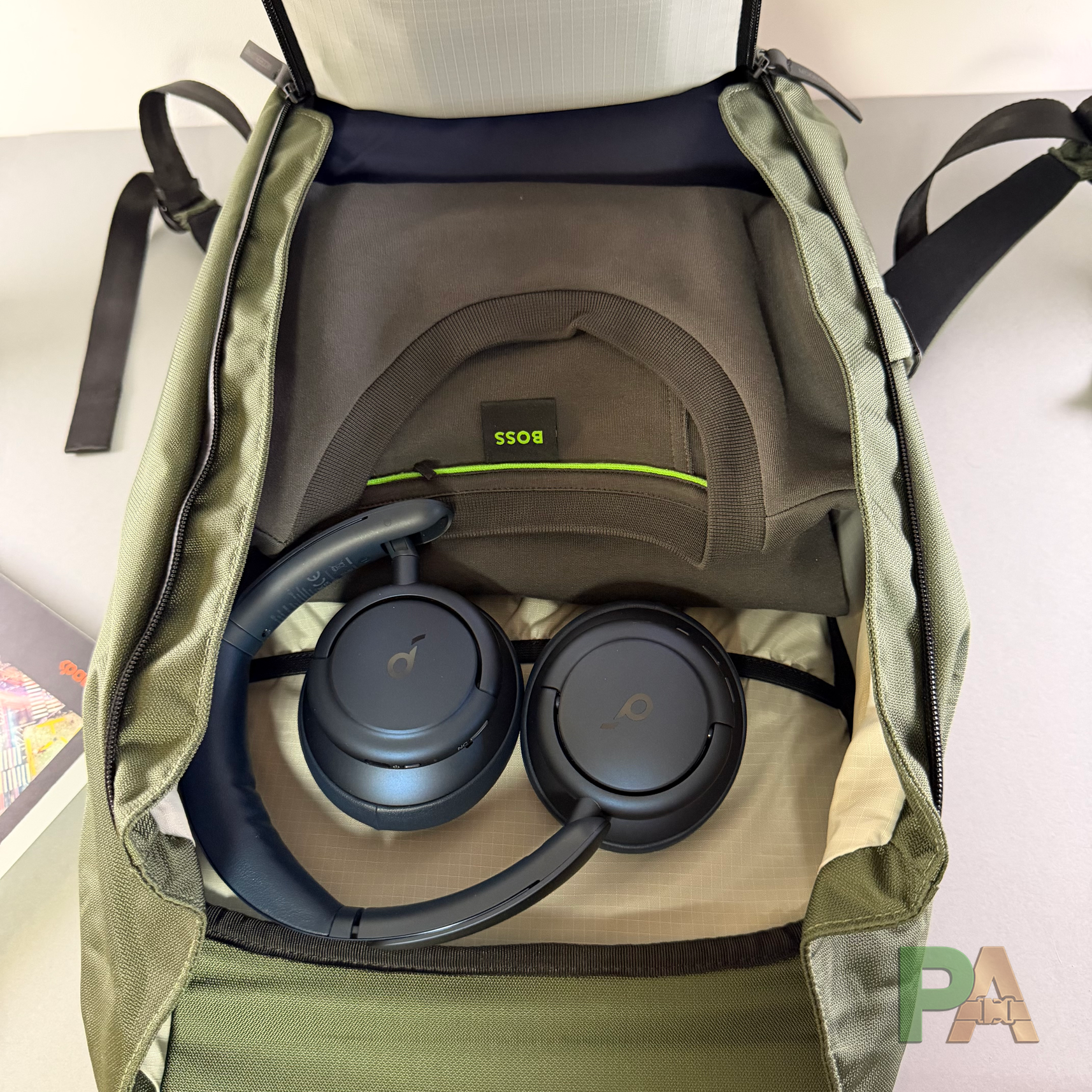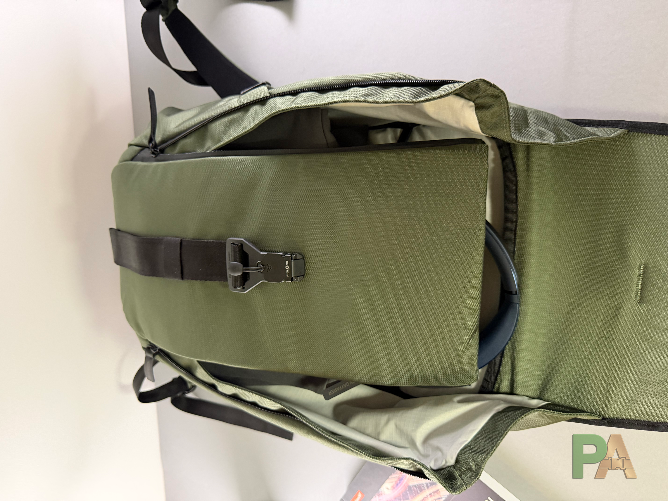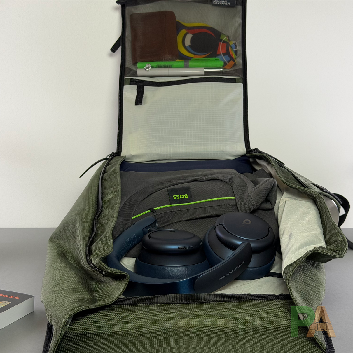 Zestaw “do pracy”: MacBook Pro 14″, iPad pro 11″, myszka, ładowarka, bluza, parasol, słuchawki nauszne Soundcore, kubek termiczny 0,5 l. Taki załadunek zostawia nam jeszcze dużo przestrzeni, która kompresuje się po zaciągnięciu paska na klapie.