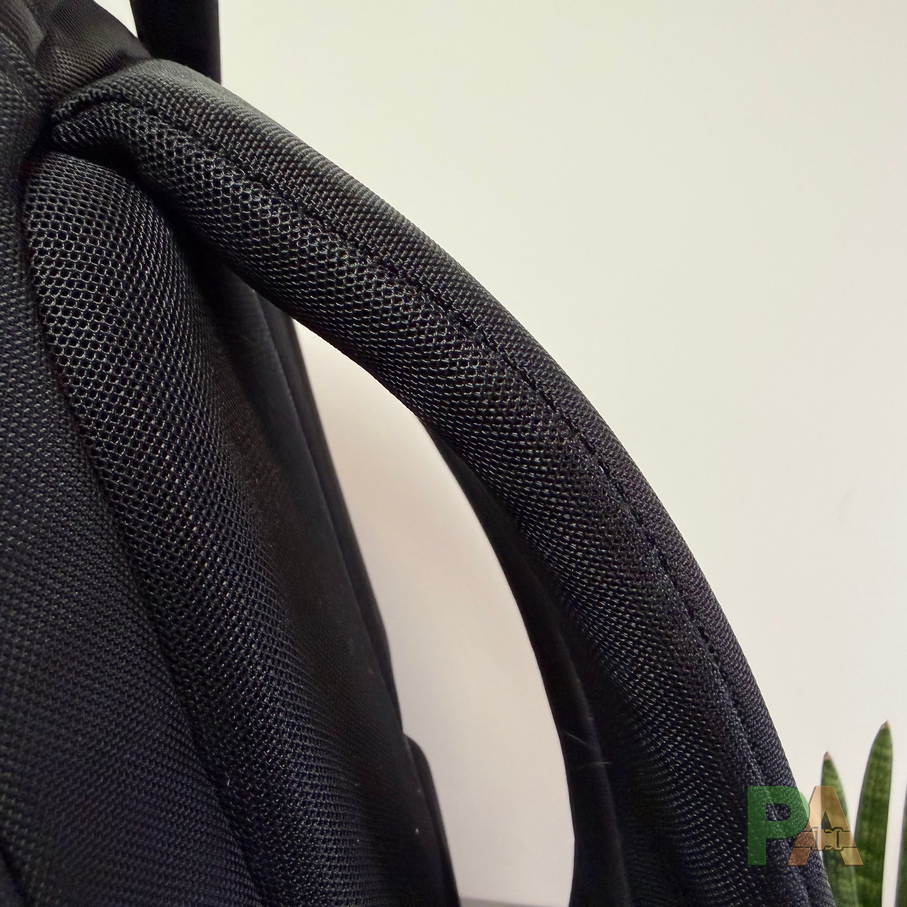 Uchwyt do przenoszenia plecaka jest miekki, wykonany z materialu jak na pasy bezpieczeństwa. Widać, że producent przemyślał jego lokalizacje i szerokość. Brakuje bocznego uchwytu, a jest na taki miejsce.