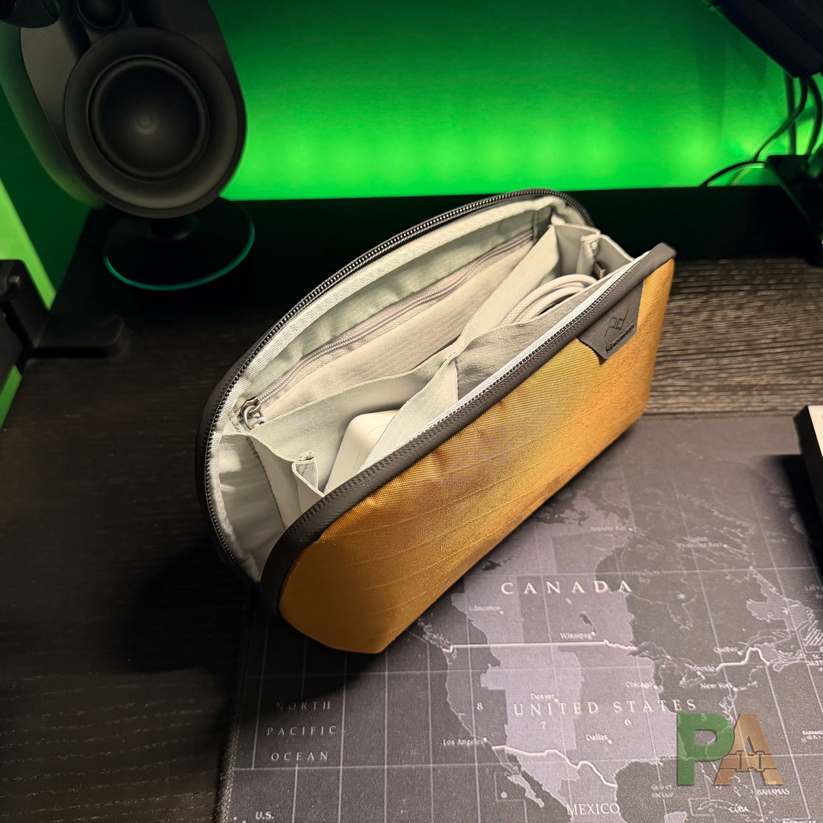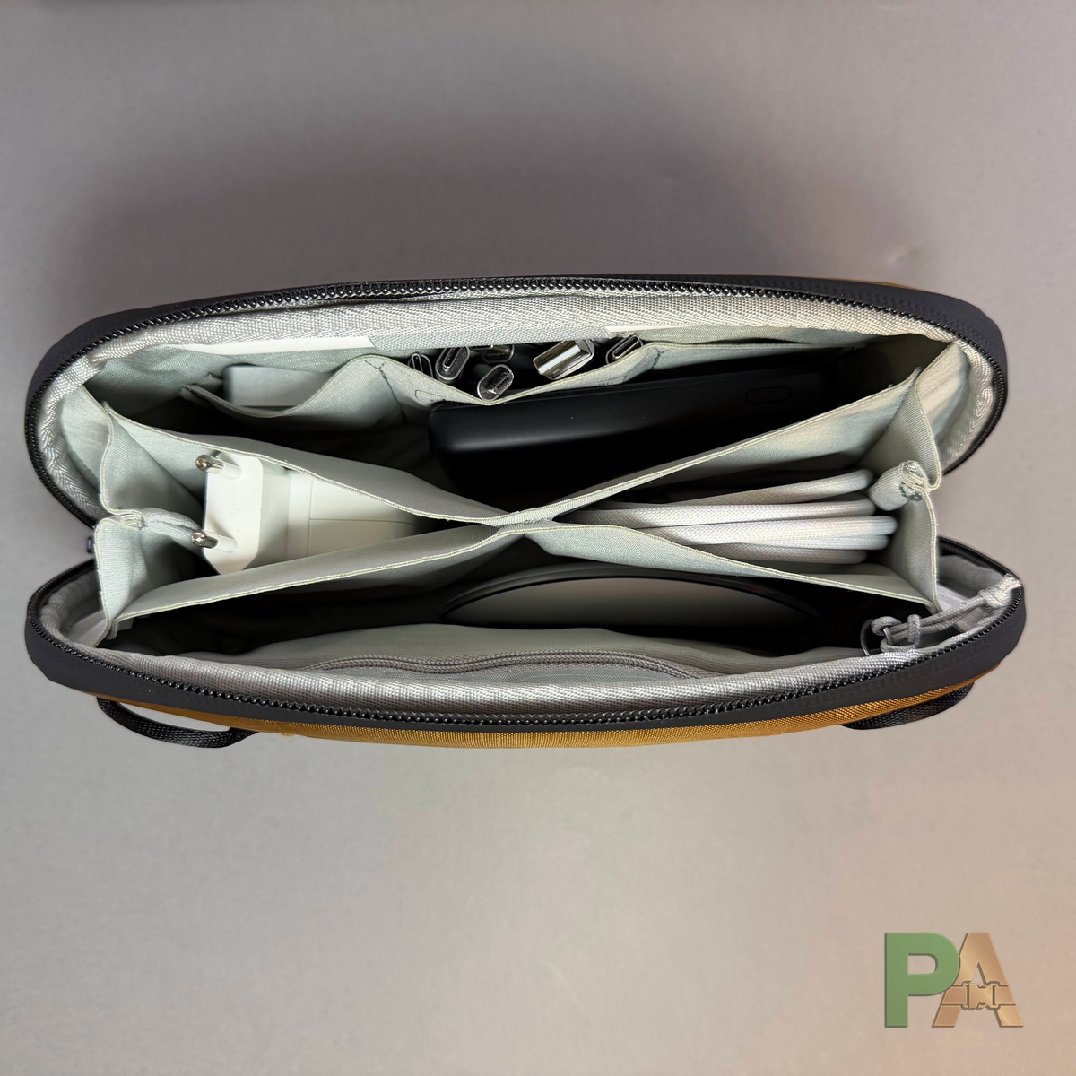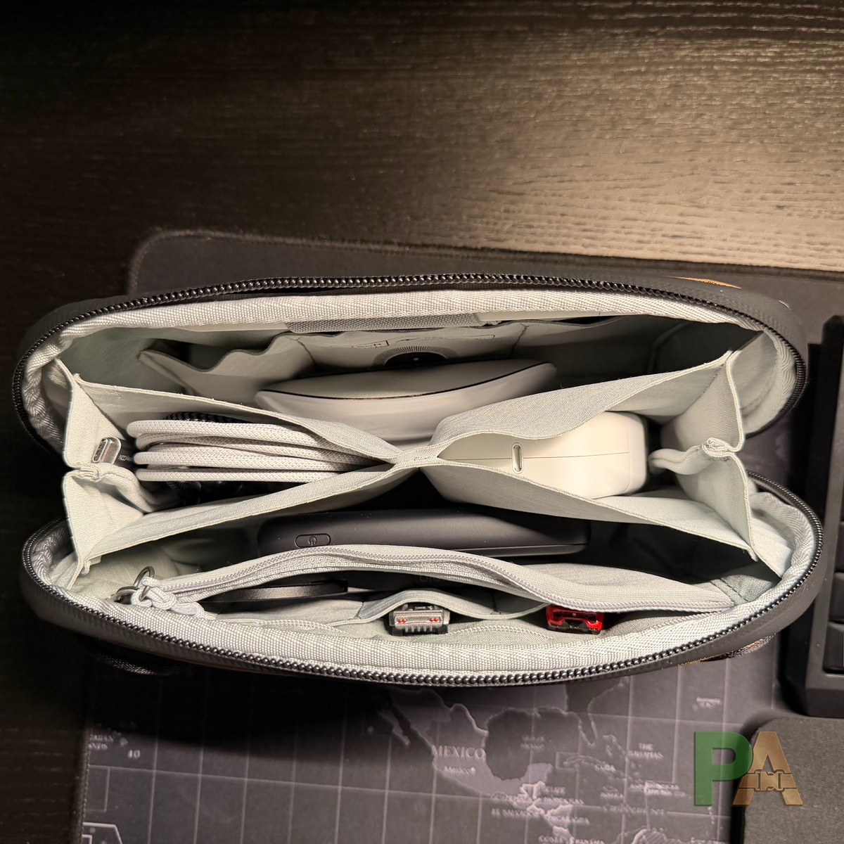 Peak Design stosuje charakterystyczny system kieszeni origami, który pozwala bardzo dobrze posegregować akcesoria. Dzięki temu po otwarciu poucha wszystko jest widoczne i łatwo dostępne. Organizer potrafi też stabilnie stać na biurku, co w praktyce okazuje się bardzo wygodne. Ilość przegródek jest ogromna i pozwala wszystko bezpiecznie zorganizować.